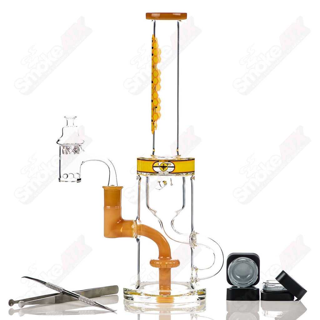 Crafted with precision, the tube features a 14mm fixed female joint seamlessly integrated with a Circ Perc to splash guard/Incyler funnel, ensuring smooth and efficient diffusion of smoke for a clean and flavorful hit every time. The addition of a 14mm quartz banger, spinner carb cap, and x2 concentrate jars further enhances its versatility, allowing you to enjoy your favorite concentrates with ease.