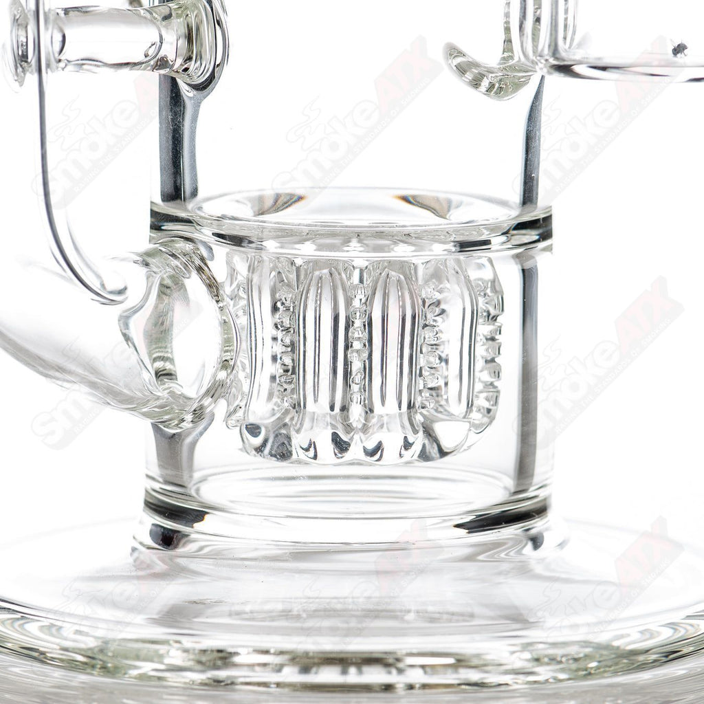 The scientific function of this piece is a result of Rob's expertise, as he grids a solid clear rod to create small holes in a barrel-like shape, forming a perc that generates small bubbles. This intricate design not only provides high-functionality but also enhances filtration with increased surface area, ensuring a smooth and satisfying smoking experience.