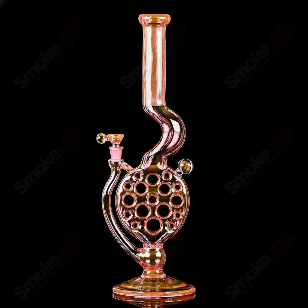 Radiant Elegance: Prepare to be enchanted by the Swill Perc Solo Collab, a piece that radiates with elegance and sophistication. The use of real gold fuming lends a deep pink hue that shimmers with a golden shine on the outside of the glass. This fusion of colors creates a mesmerizing interplay of light, infusing the piece with a sense of opulence and luxury.